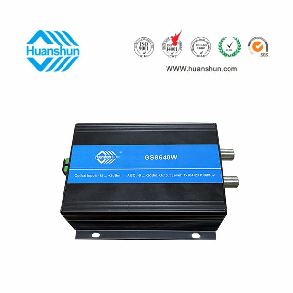 樓棟光接收機 | GS8640W | 47~860MHz,-7~+2dBm/RF 1×106或2×102dBuv,電調輸出電平和斜率均衡,外置 90~255V-12V 1A 電源適配器 |