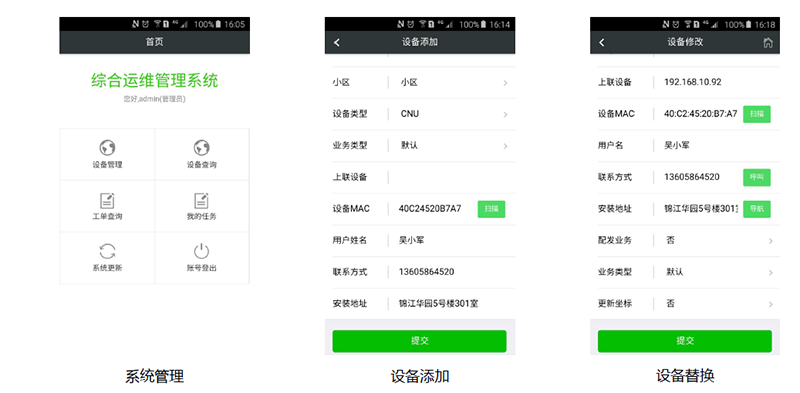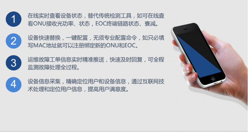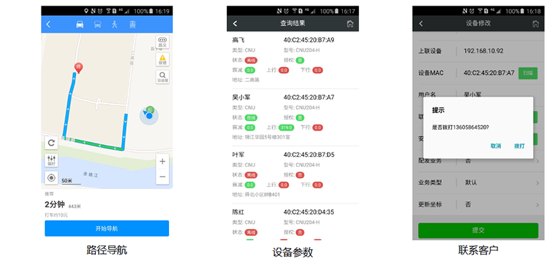 手機移動端可以規劃運維路徑,設備鏈路狀態和運行狀態,調用撥號功能可以便捷聯系客戶,掃描終端MAC可以實現快速更換,無需專業命令配置。