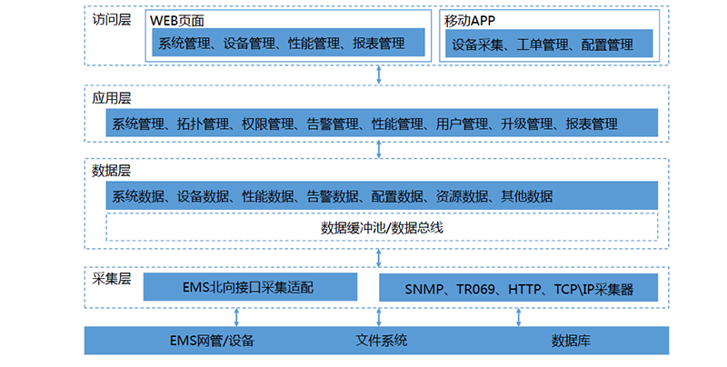 系統架構分為采集層、數據層、 應用層和訪問層。